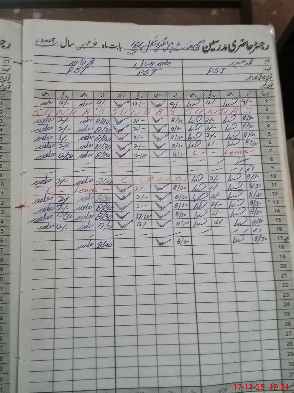 | CNIC | Full Name | Designation | R/C | Absence During Last Calender Month |