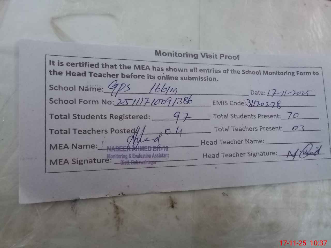 | Attendance Register | Head Teacher | MEA with School | Visit Proof |