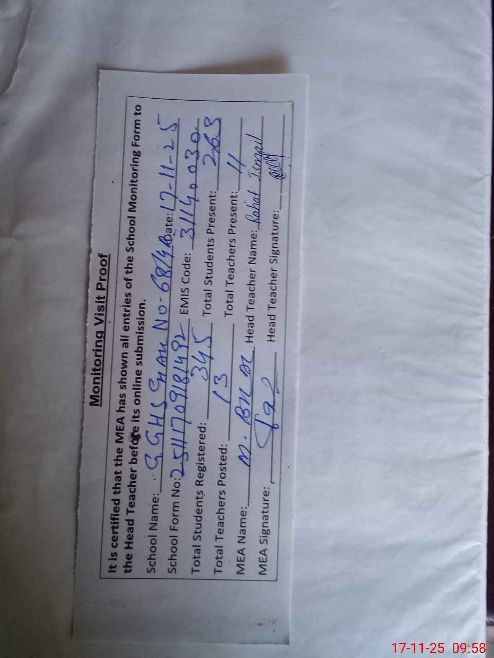 | Attendance Register | Head Teacher | MEA with School | Visit Proof |