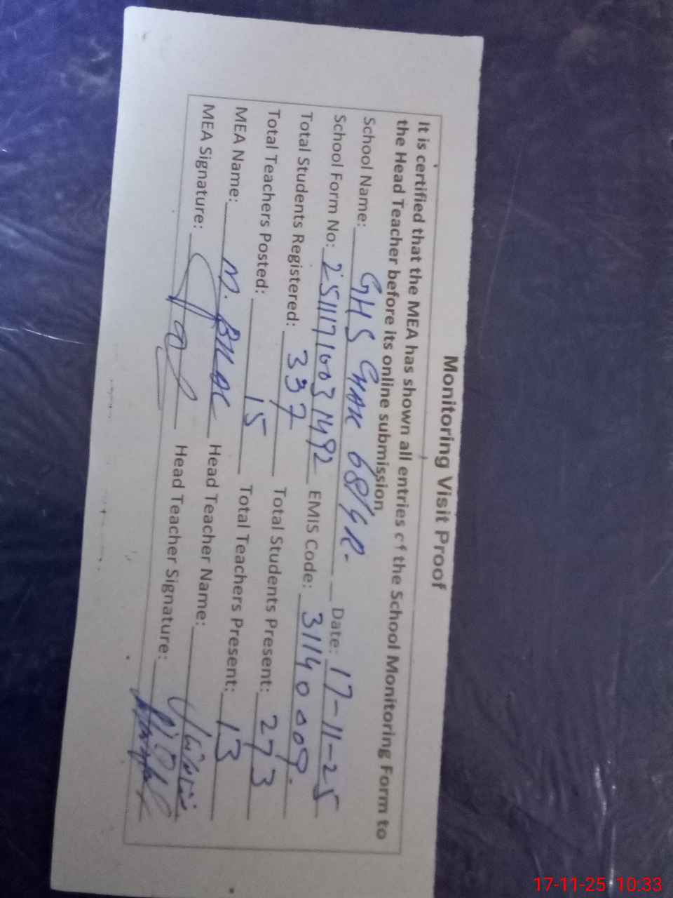 | Attendance Register | Head Teacher | MEA with School | Visit Proof |