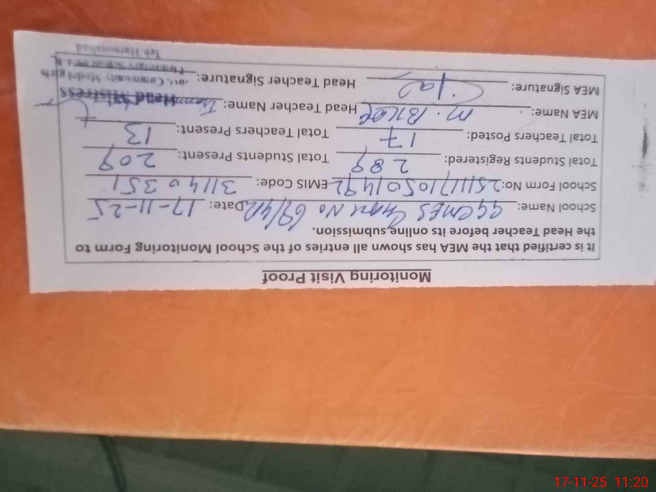 | Attendance Register | Head Teacher | MEA with School | Visit Proof |