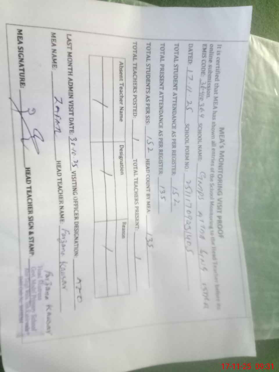 | Attendance Register | Head Teacher | MEA with School | Visit Proof |