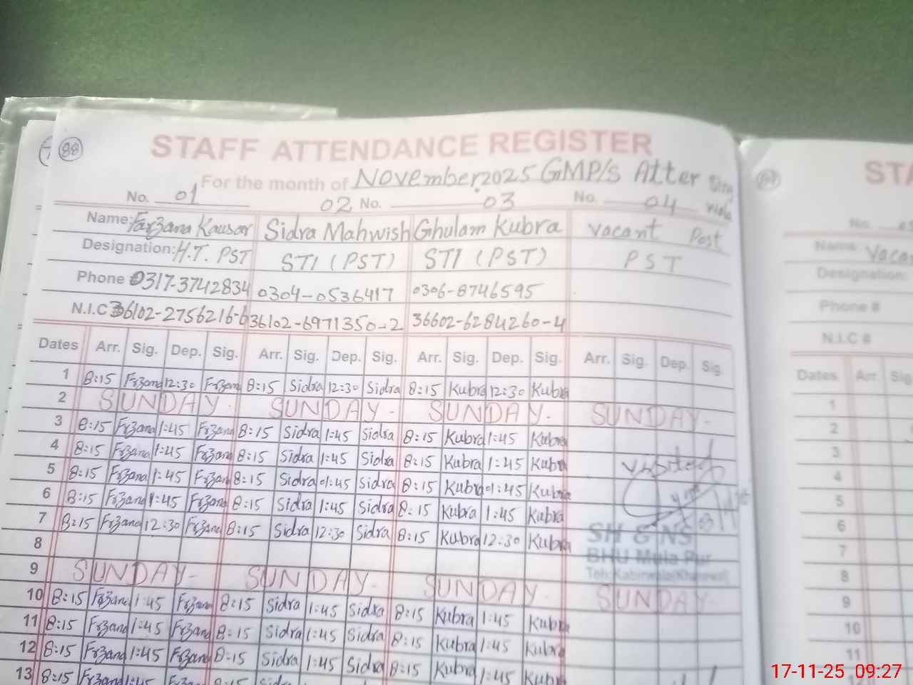 | CNIC | Full Name | Designation | R/C | Absence during last cal. month |