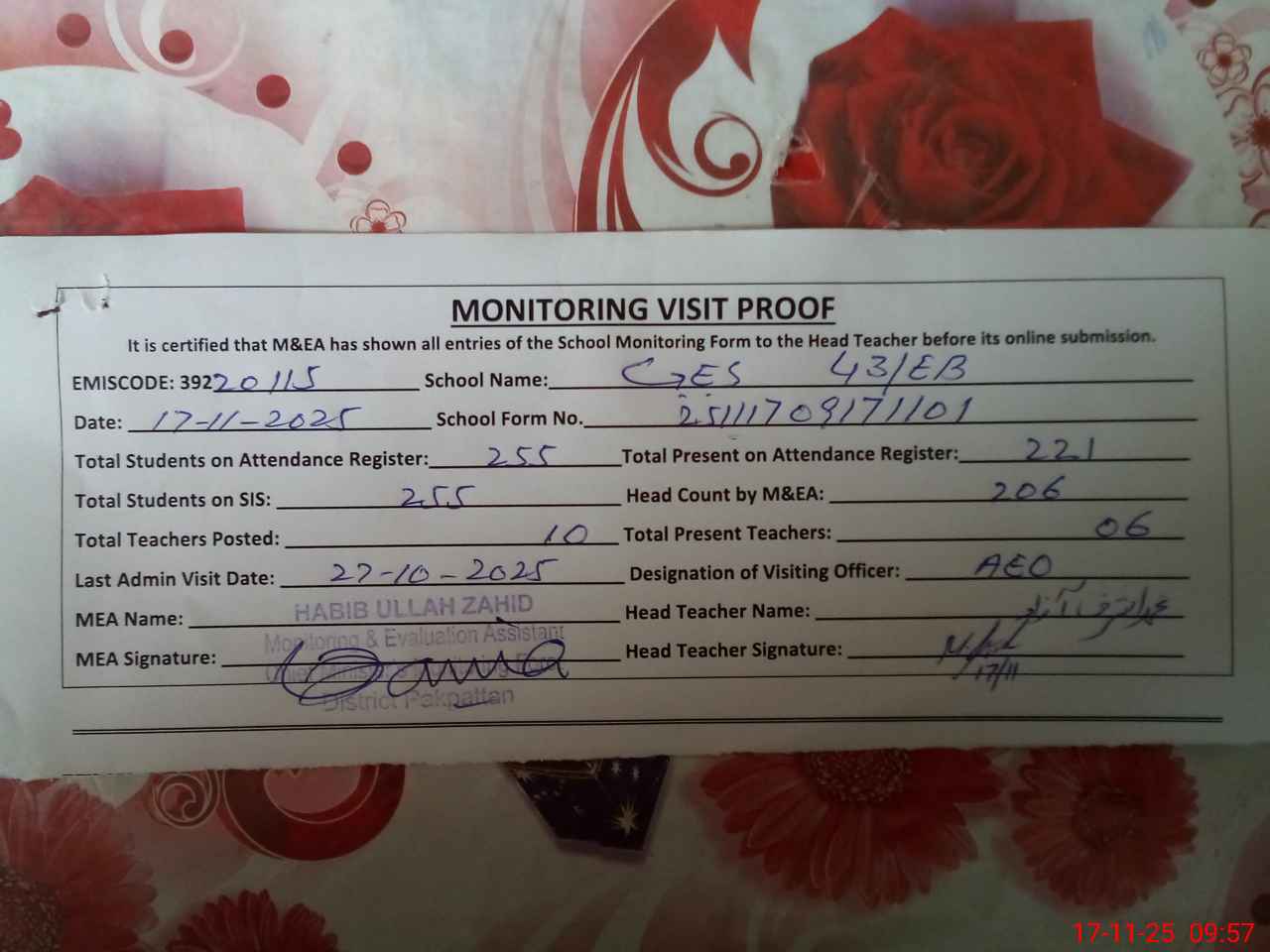 | Attendance Register | Head Teacher | MEA with School | Visit Proof |