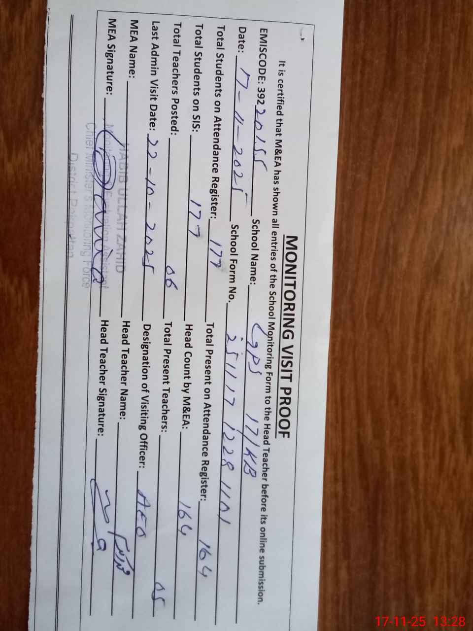 | Attendance Register | Head Teacher | MEA with School | Visit Proof |
