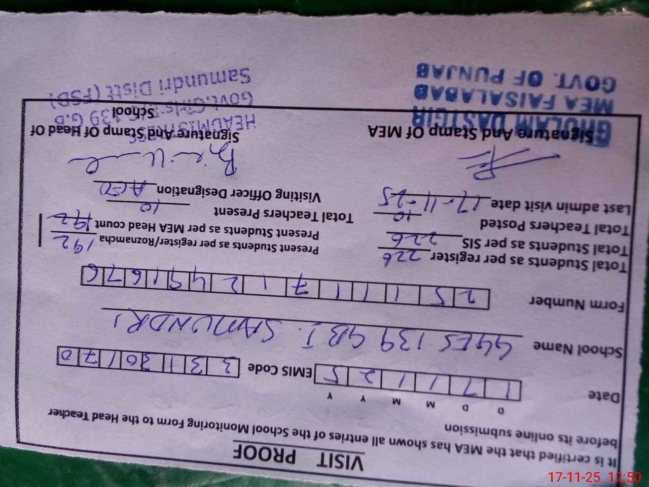 | Attendance Register | Head Teacher | MEA with School | Visit Proof |