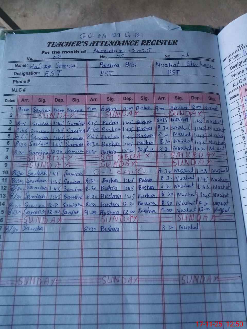 | CNIC | Full Name | Designation | R/C | Absence During Last Calender Month |