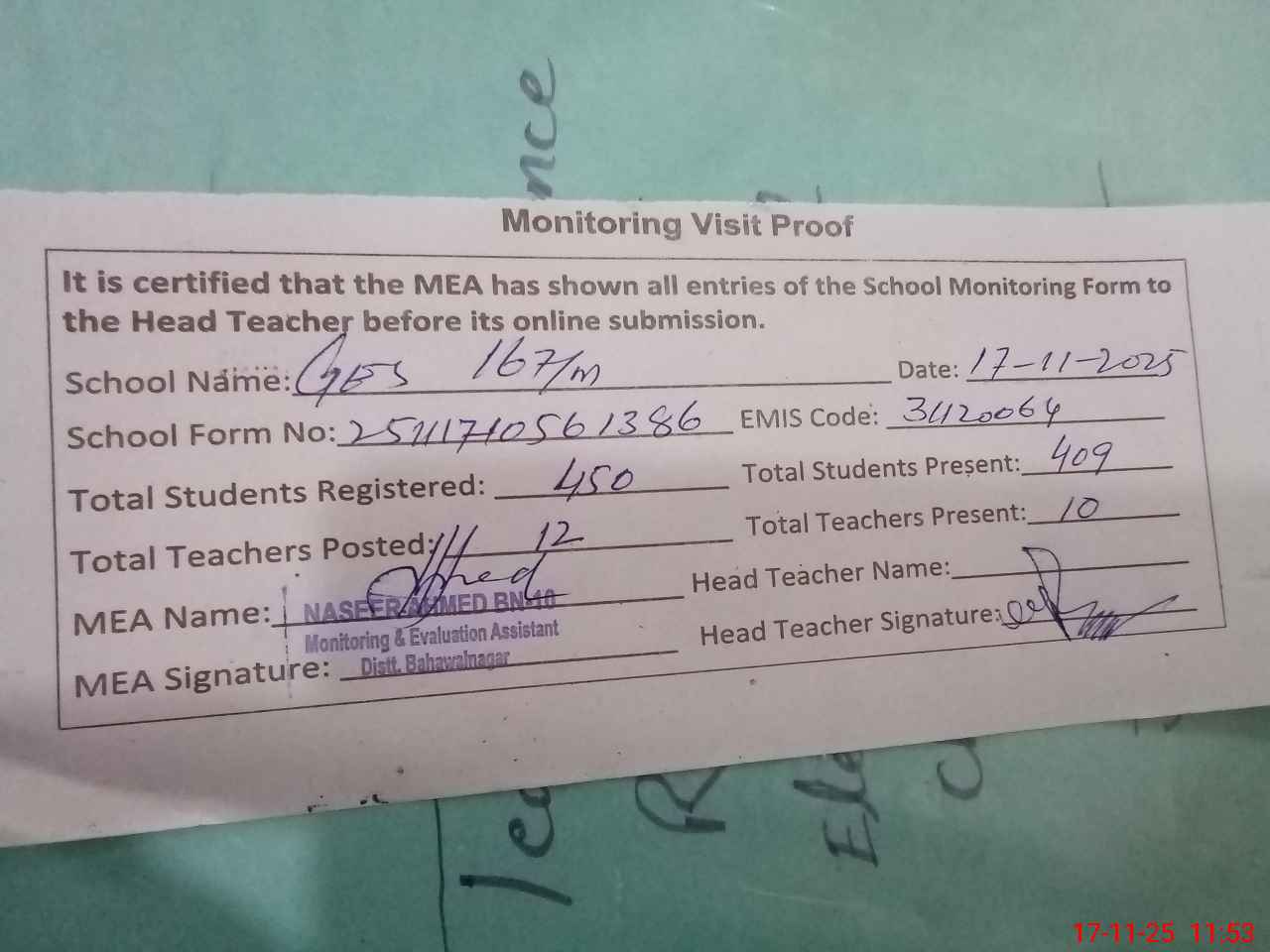 | EMIS Code: 31120064 | Name of School: GES CHAK 167/M | |||