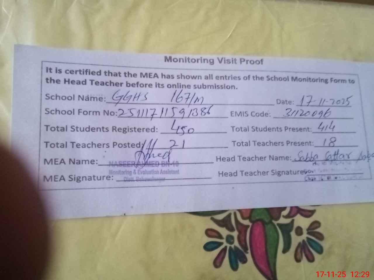 | Attendance Register | Head Teacher | MEA with School | Visit Proof |