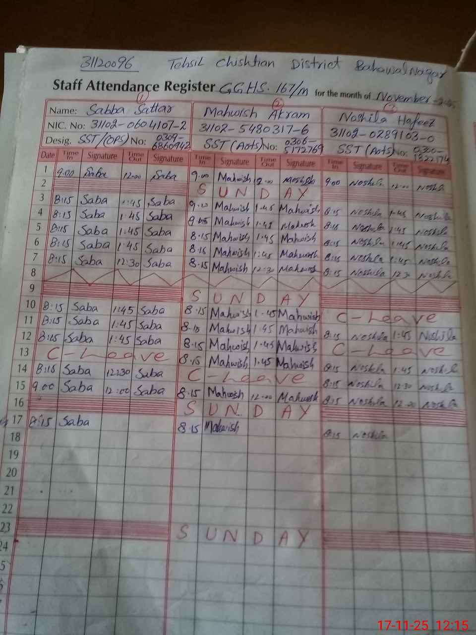 | CNIC | Full Name | Designation | R/C | Absence During Last Calender Month |