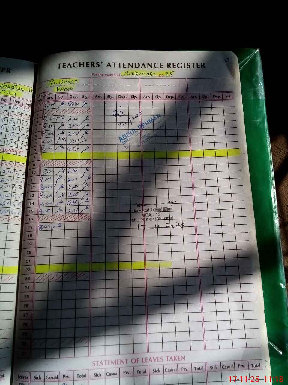 | CNIC | Full Name | Designation | R/C | Absence During Last Calender Month |