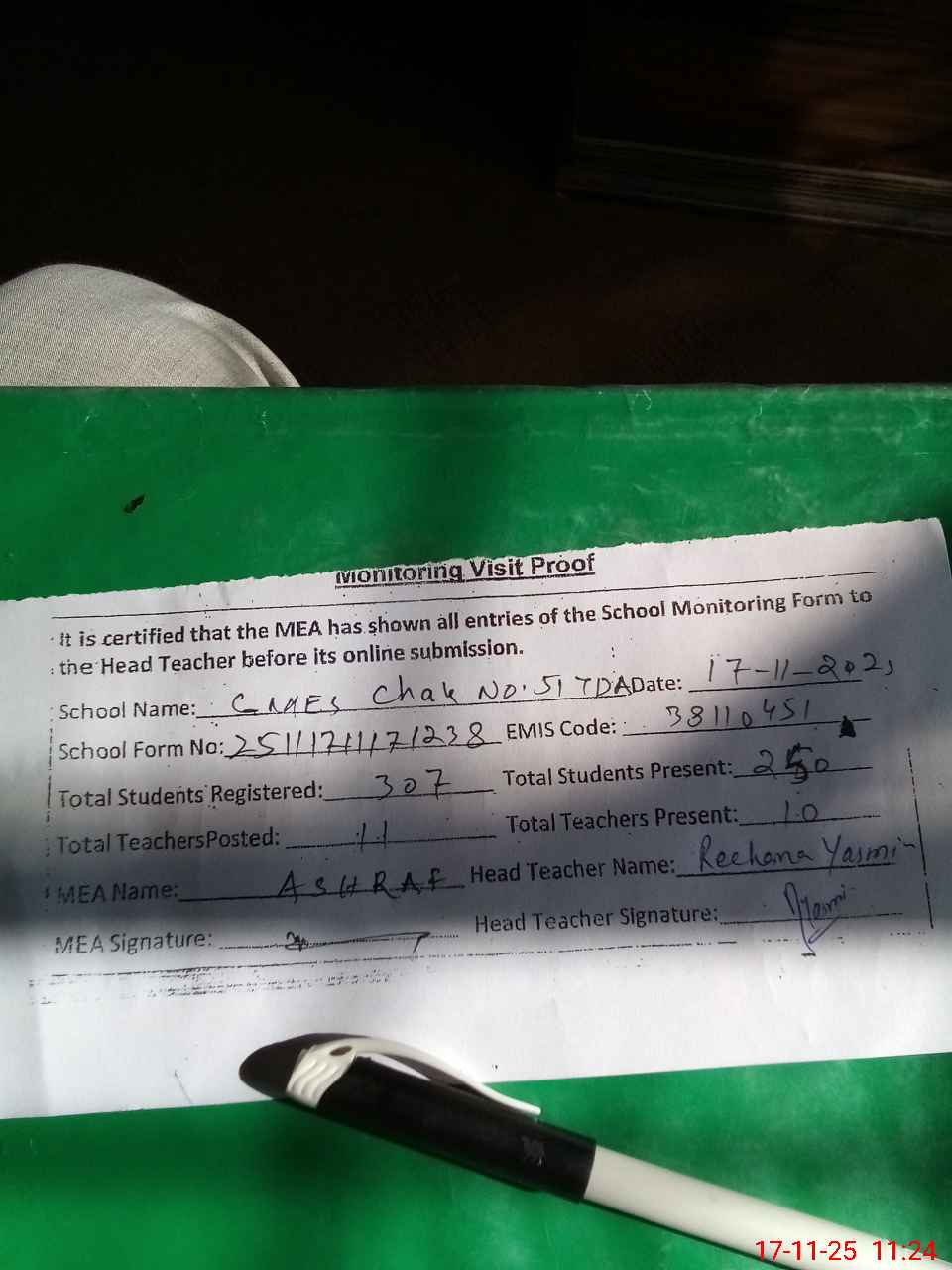 | Attendance Register | Head Teacher | MEA with School | Visit Proof |
