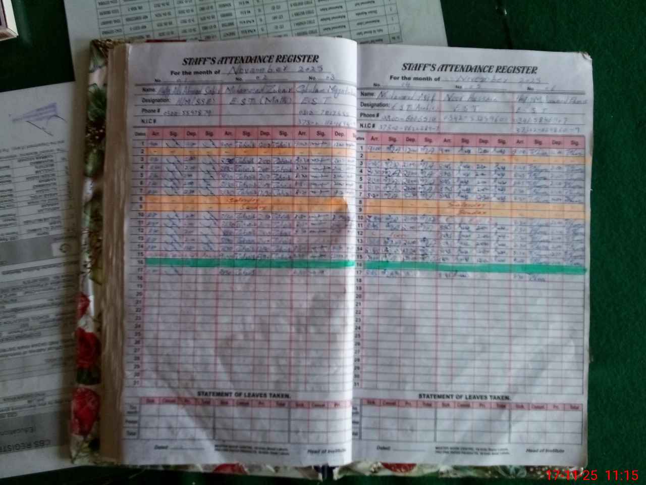 | CNIC | Full Name | Designation | R/C | Absence During Last Calender Month |
