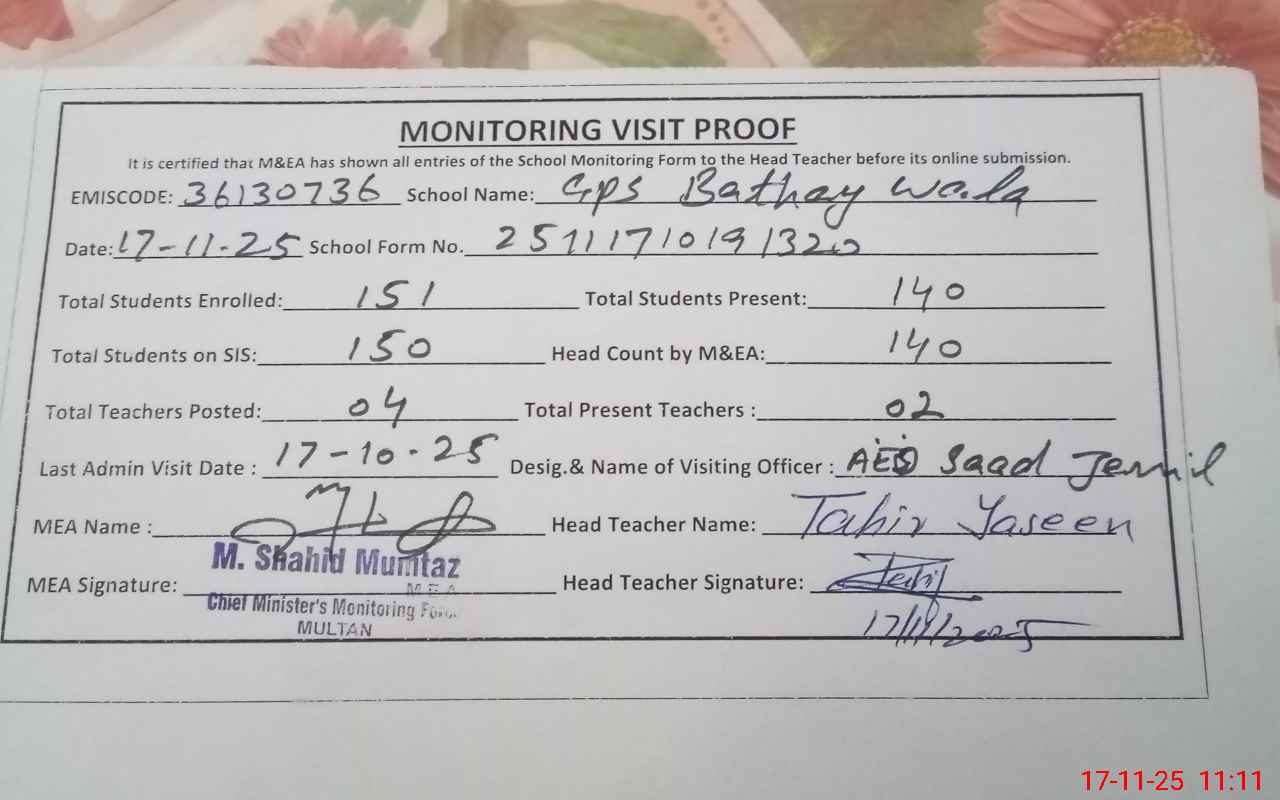 | EMIS Code: 36130736 | Name of School: GPS BATHEY WALA MULTAN | |||