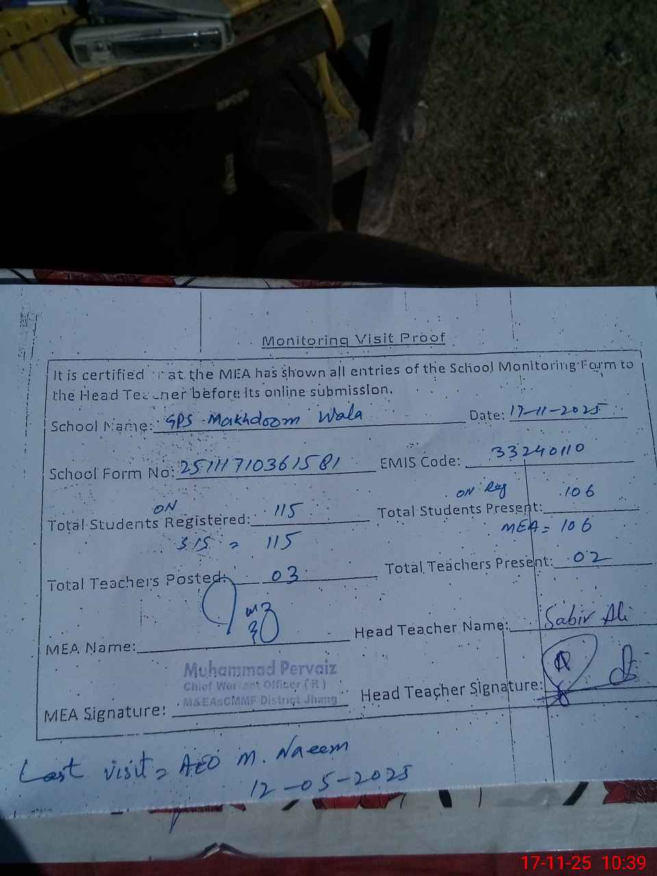 | Attendance Register | Head Teacher | MEA with School | Visit Proof |