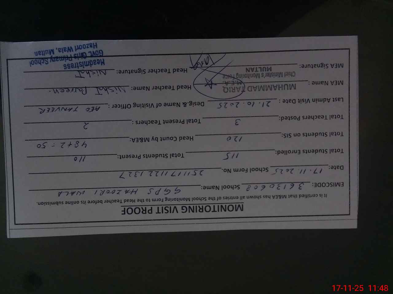 | EMIS Code: 36130608 | Name of School: GGPS HAZOORI WALA MULTAN | |||