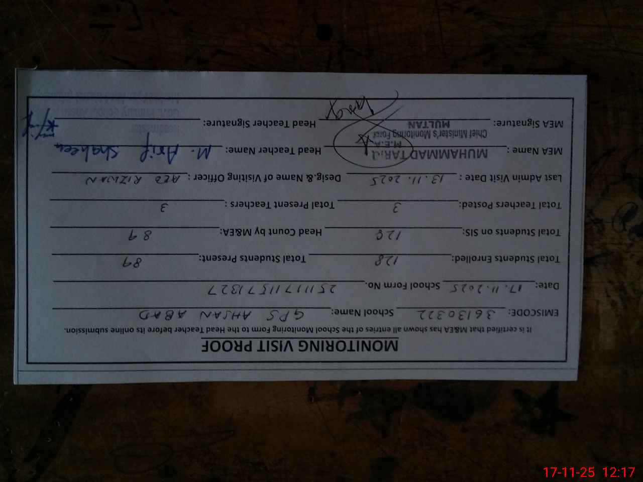 | Certified that this School was Inspected by the Undersigned MEA/DMO Today and the Information Stated Above is as Per Record. | |||||