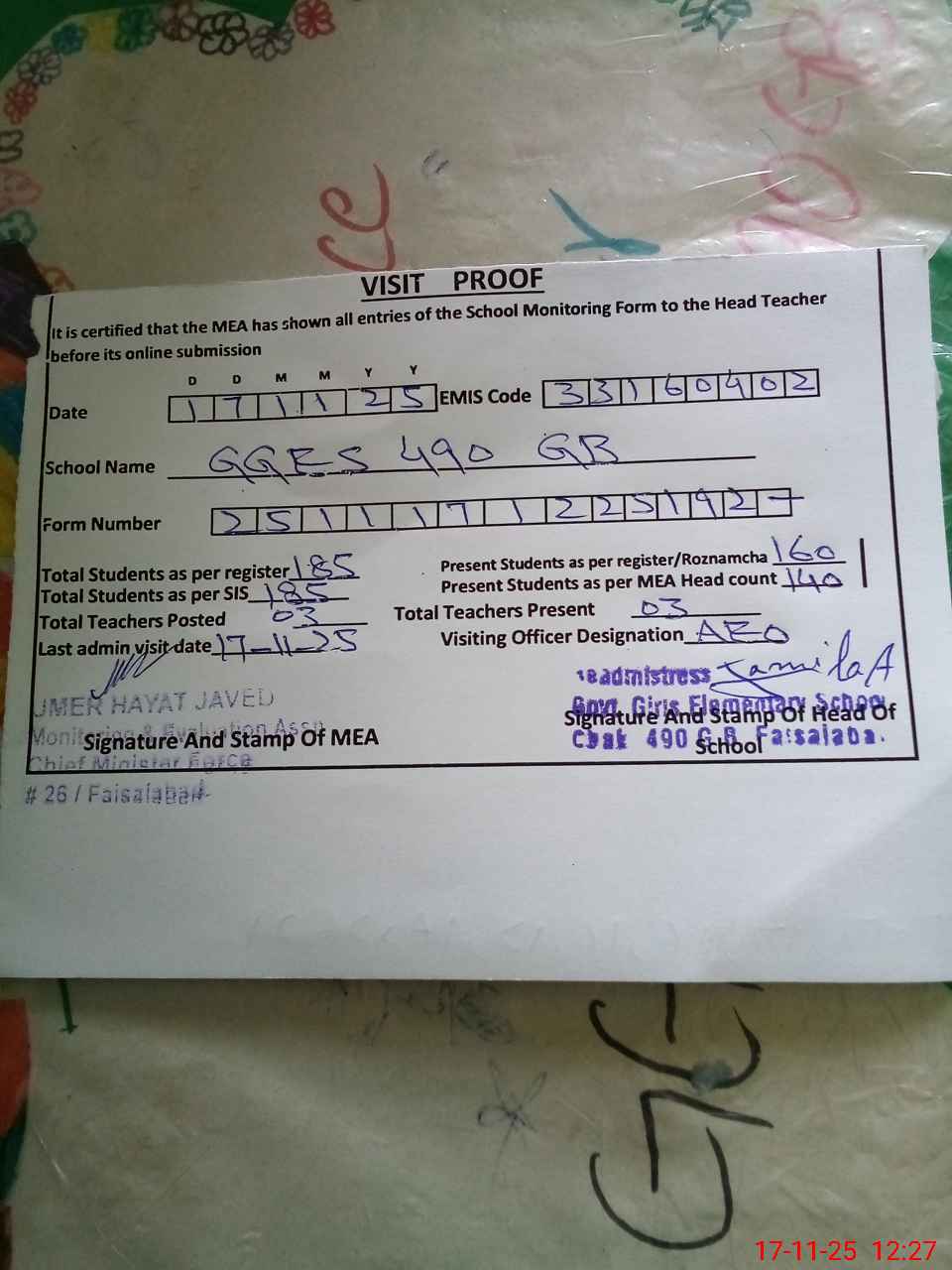 | Attendance Register | Head Teacher | MEA with School | Visit Proof |