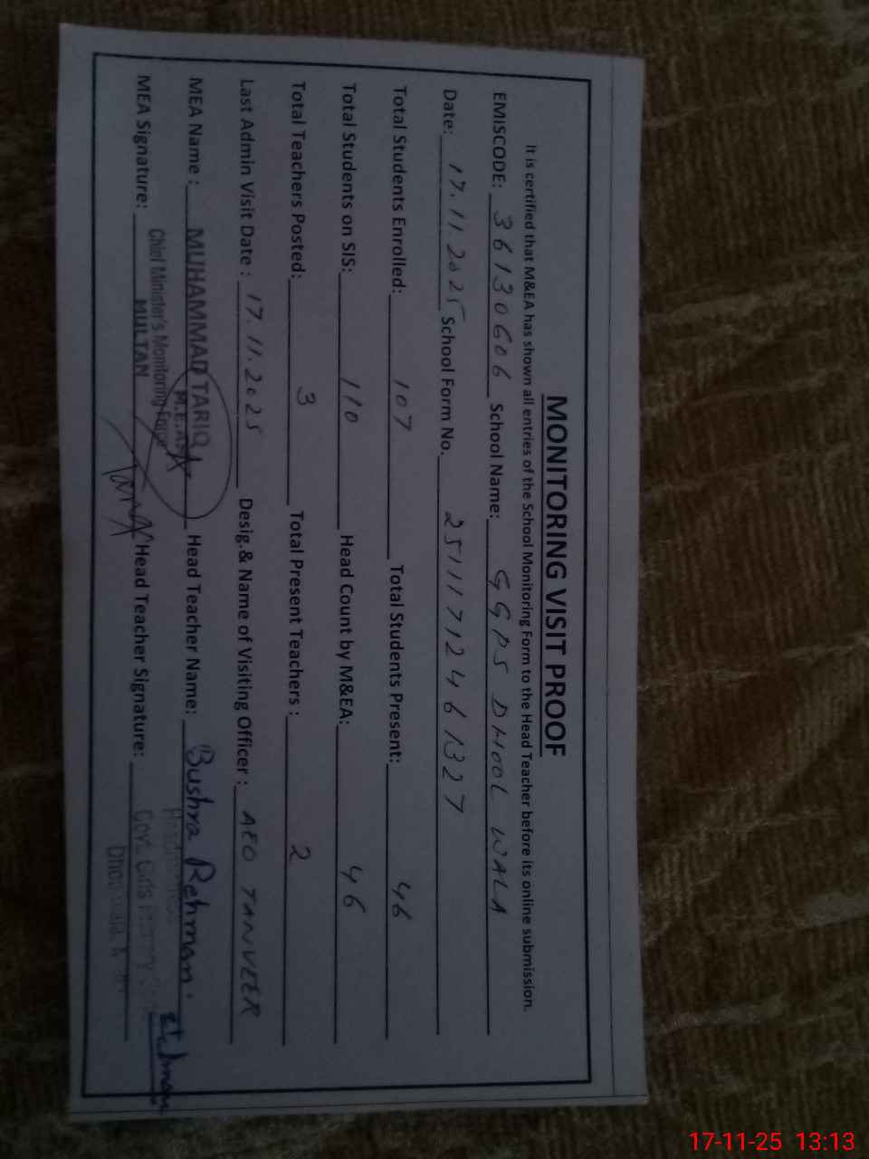| Certified that this School was Inspected by the Undersigned MEA/DMO Today and the Information Stated Above is as Per Record. | |||||