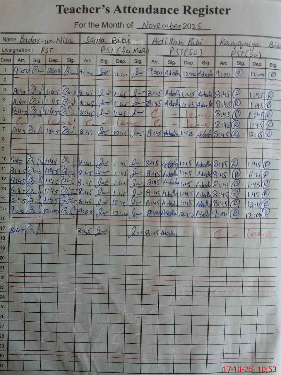 | CNIC | Full Name | Designation | R/C | Absence During Last Calender Month |
