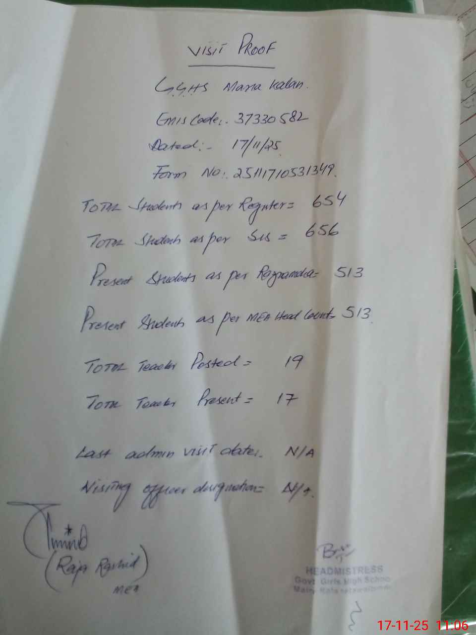 | Attendance Register | Head Teacher | MEA with School | Visit Proof |