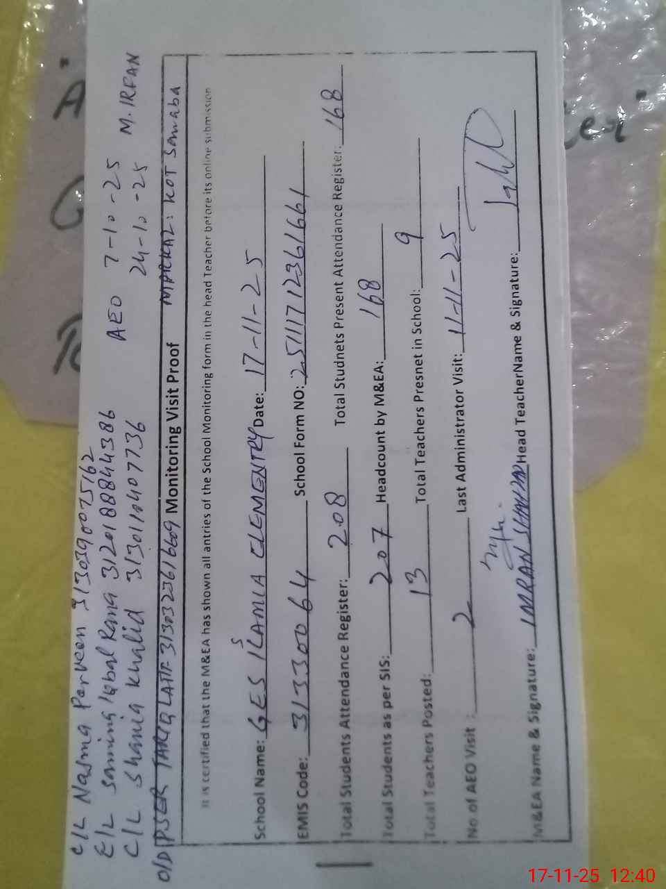 | Attendance Register | Head Teacher | MEA with School | Visit Proof |