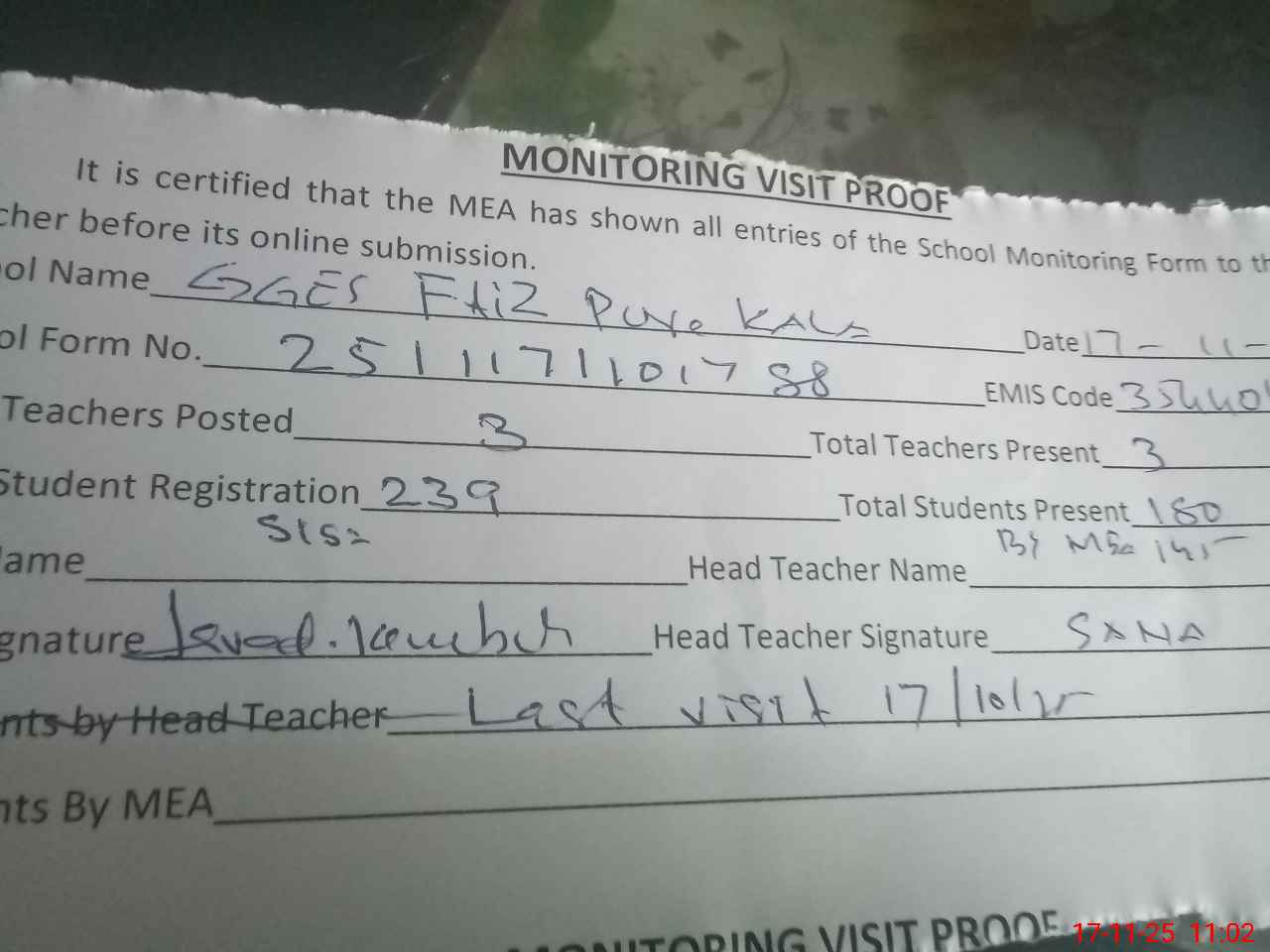 | Attendance Register | Head Teacher | MEA with School | Visit Proof |