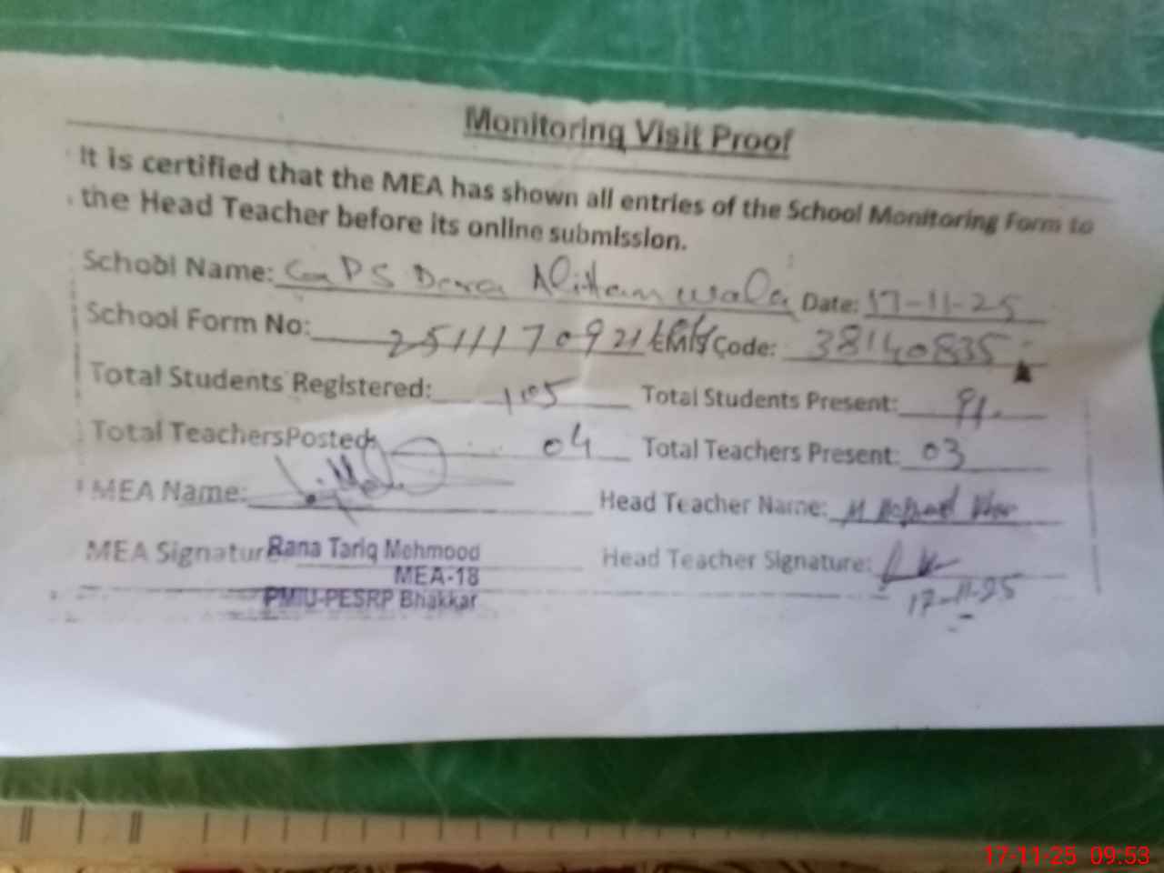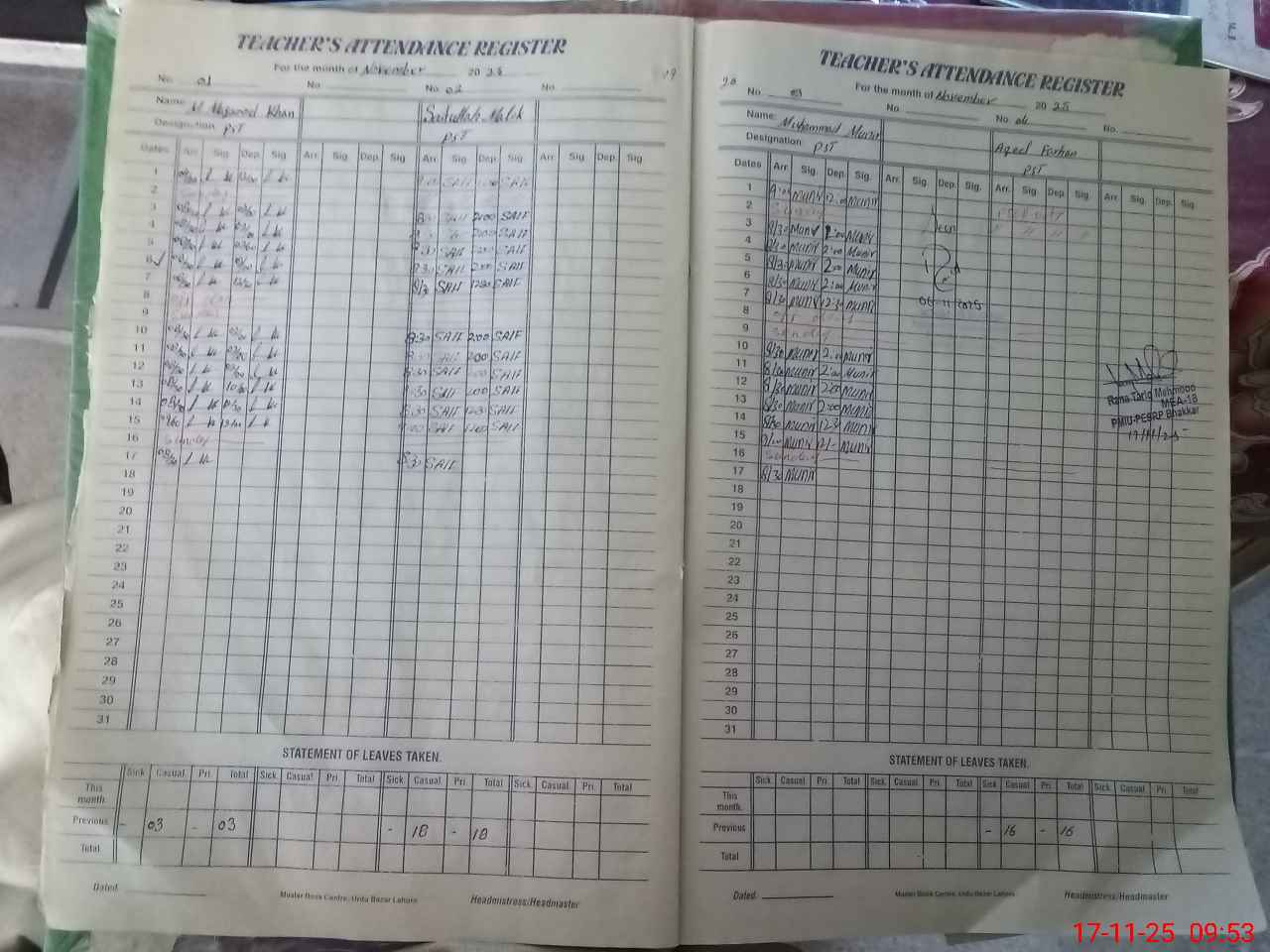 | Remarks (Use Separate Page if Required): Last visit of Education Authority 1 Designation AEO 2 Name Khalid Hanif 3 Date 25 Oct 2025 | |||||