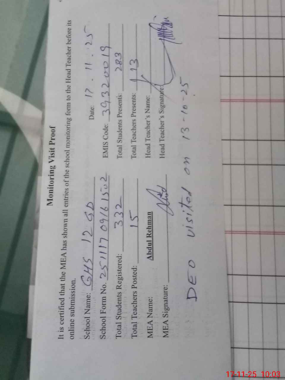| Remarks (Use Separate Page if Required): DEO visited on 13 October 2025 | |||||