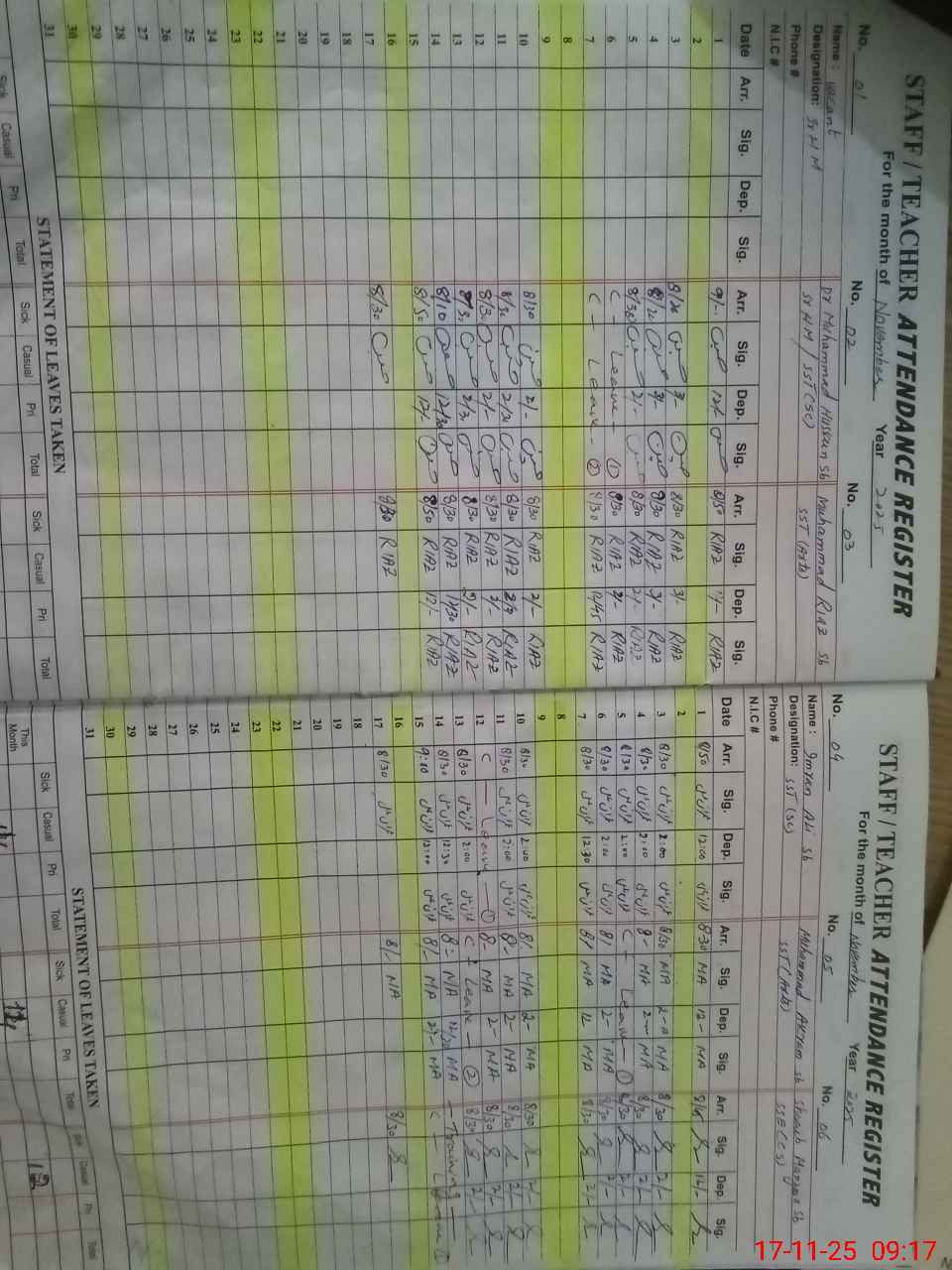 | CNIC | Full Name | Designation | R/C | Absence During Last Calender Month |
