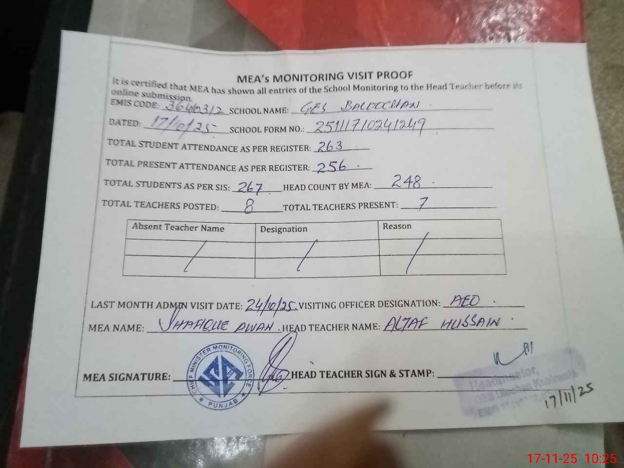 | Attendance Register | Head Teacher | MEA with School | Visit Proof |