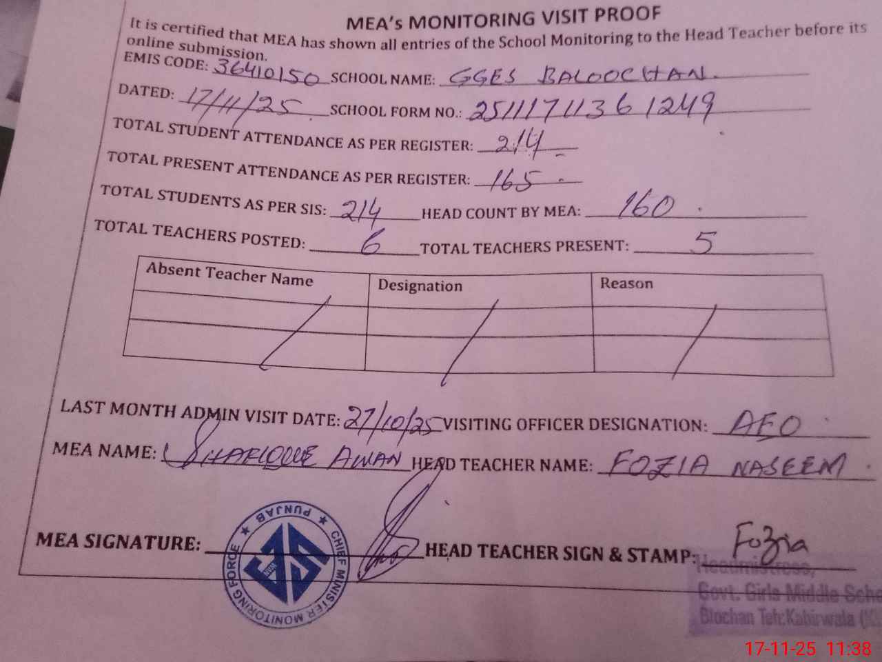 | Attendance Register | Head Teacher | MEA with School | Visit Proof |