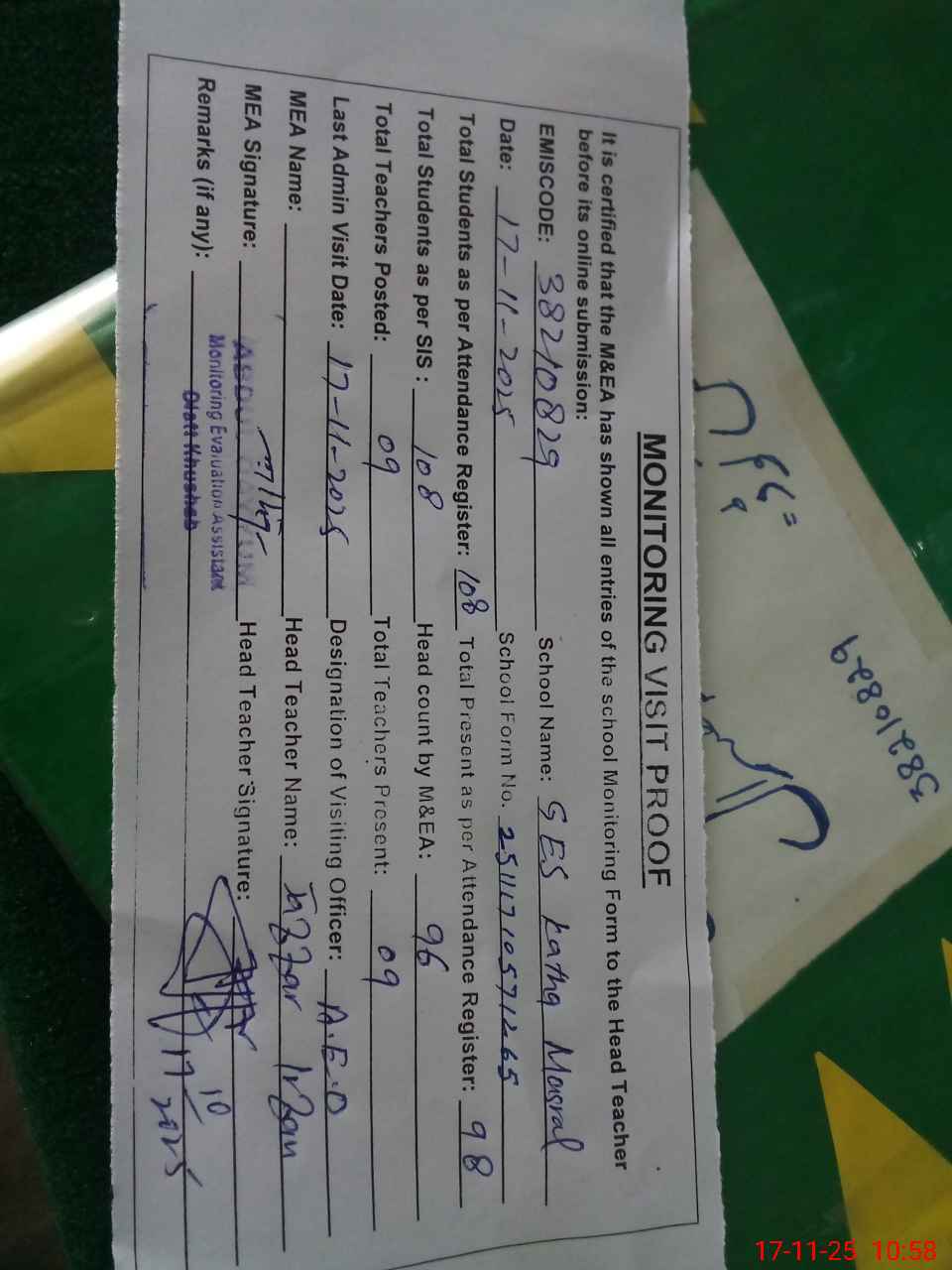 | Attendance Register | Head Teacher | MEA with School | Visit Proof |