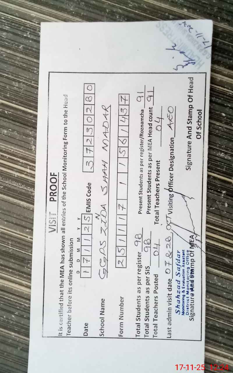 | EMIS Code: 37230280 | Name of School: GGPS ZINDA SHAH MADAR | |||