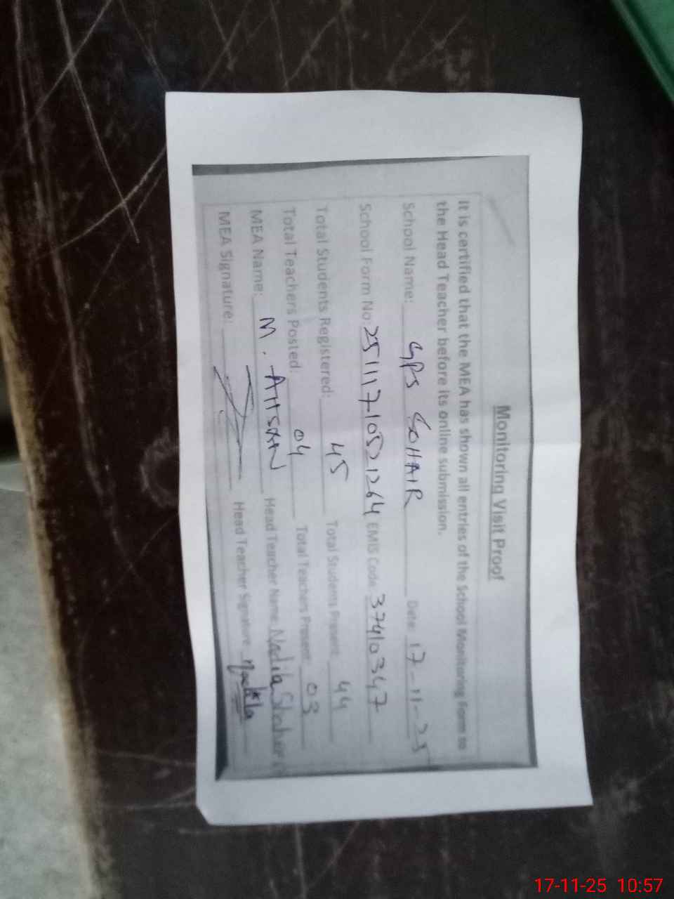 | Attendance Register | Head Teacher | MEA with School | Visit Proof |
