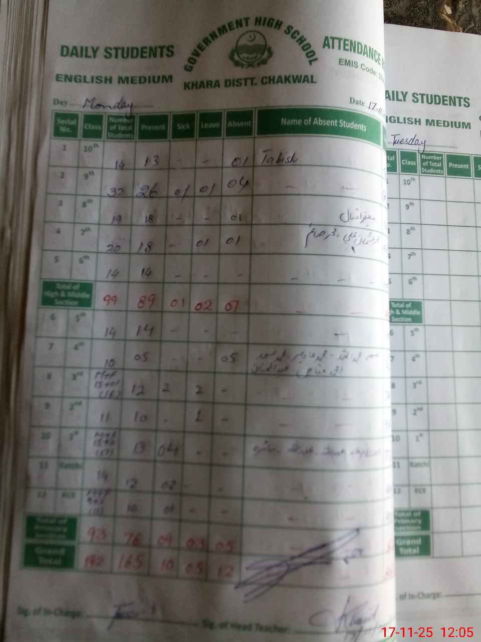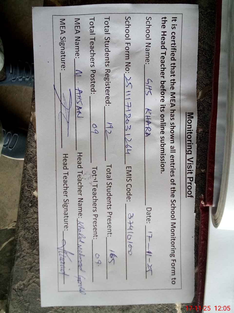| Attendance Register | Head Teacher | MEA with School | Visit Proof |