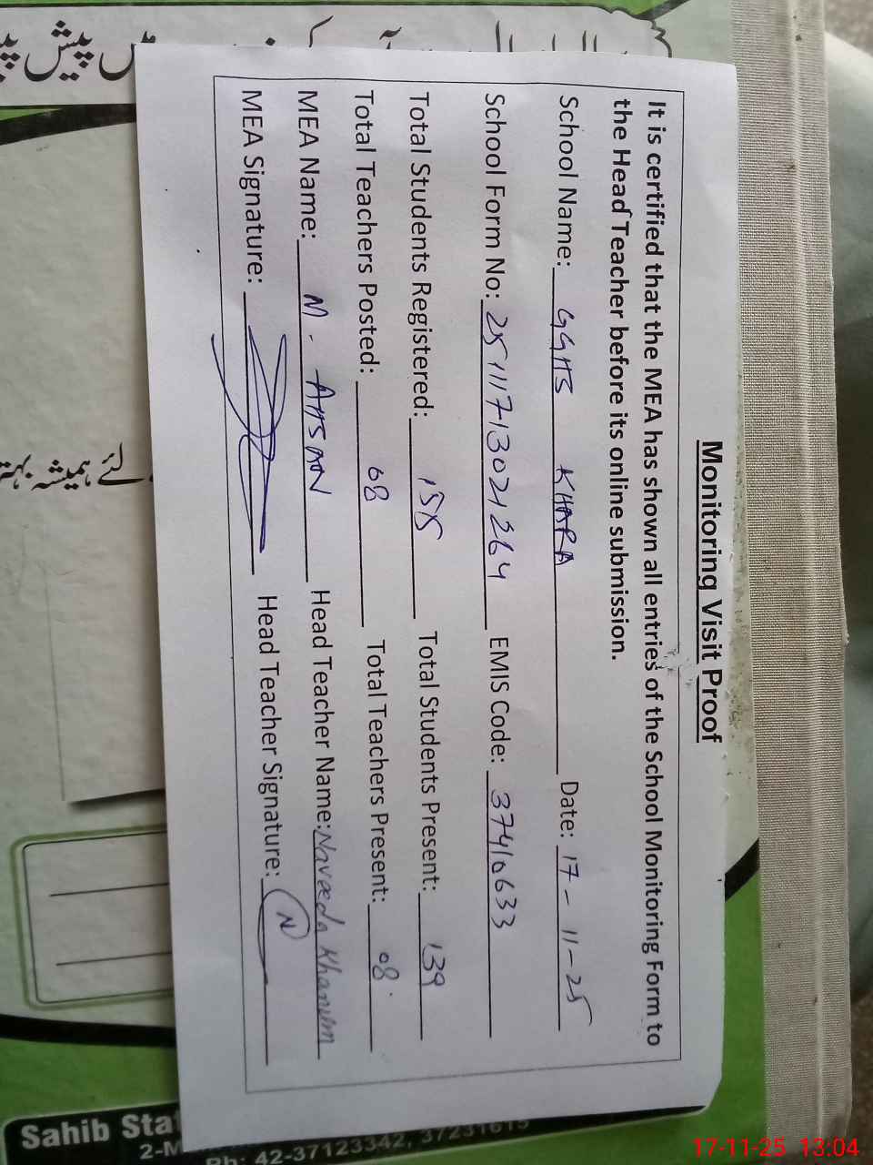 | Attendance Register | Head Teacher | MEA with School | Visit Proof |