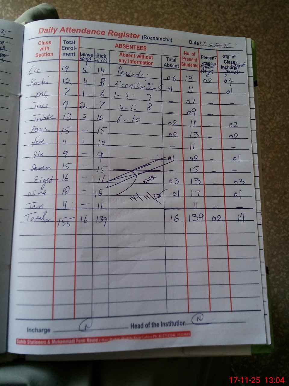| Total Students Present | 13 | 0 | 11 | 7 | 9 | 11 | 13 | 11 | 8 | 15 | 13 | 17 | 11 | 139 | ||