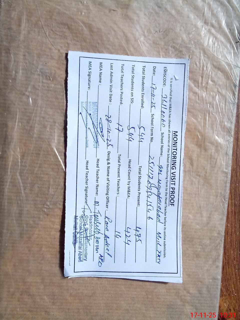 | Monitoring Date: 17-11-2025 | Start Time: 17-11-2025 09:54 AM | End Time: 17-11-2025 10:31 AM | Name of MEA: Mu**** Ma**** | |