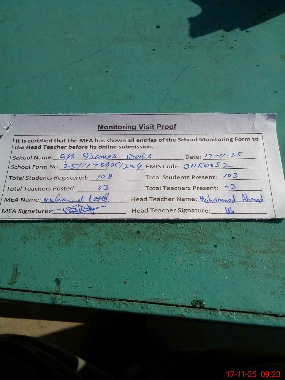 | EMIS Code: 31150052 | Name of School: GPS SHAMAS WALA | |||