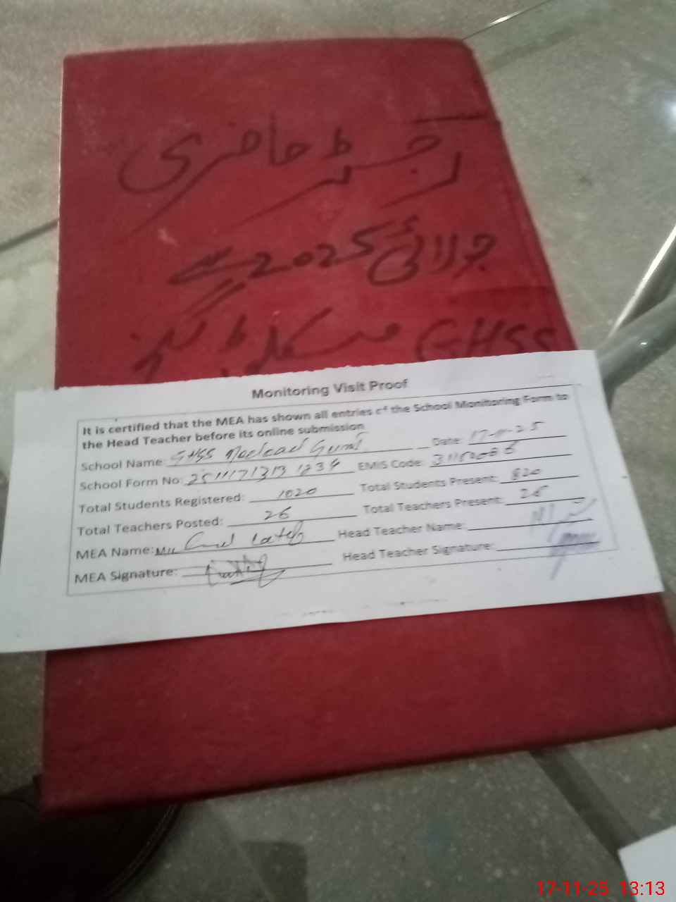 | Attendance Register | Head Teacher | MEA with School | Visit Proof |