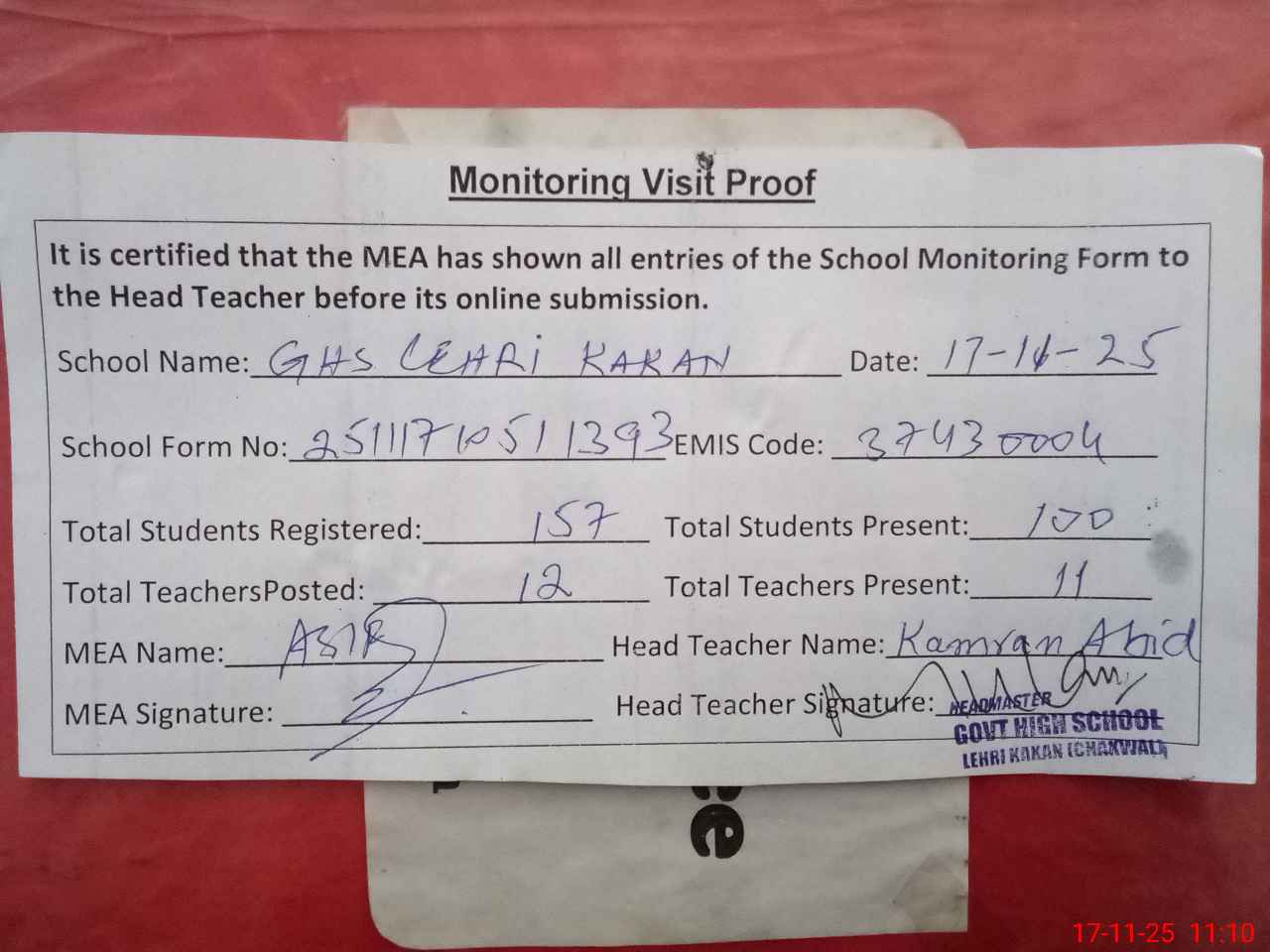 | Attendance Register | Head Teacher | MEA with School | Visit Proof |