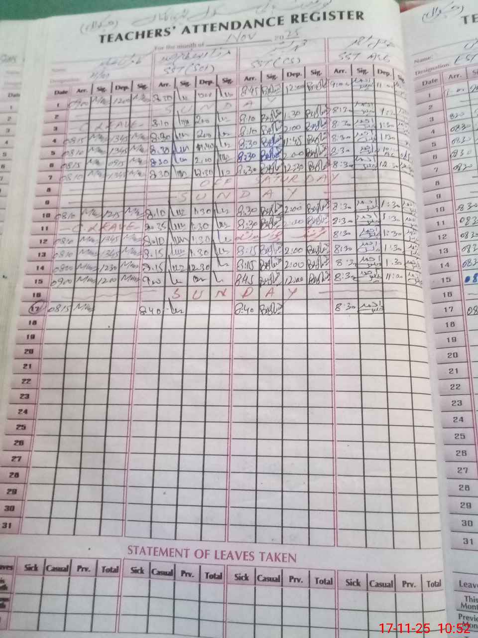| CNIC | Full Name | Designation | R/C | Absence During Last Calender Month |