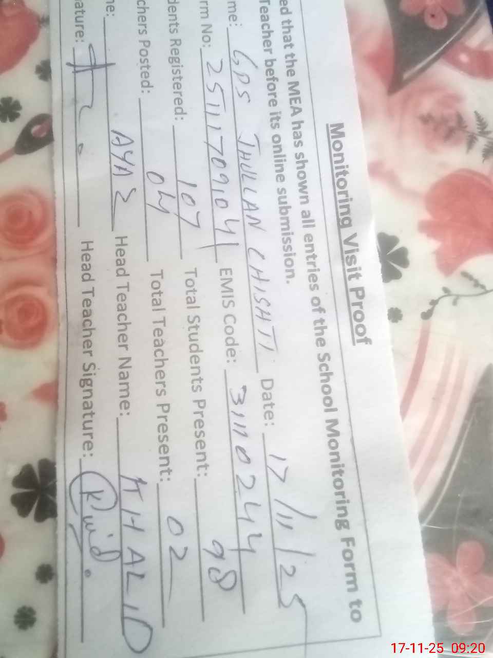 | Attendance Register | Head Teacher | MEA with School | Visit Proof |