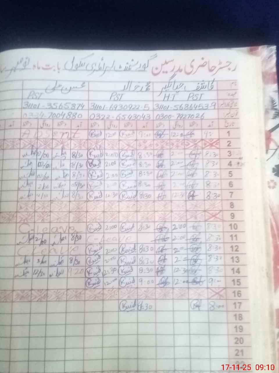 | CNIC | Full Name | Designation | R/C | Absence During Last Calender Month |
