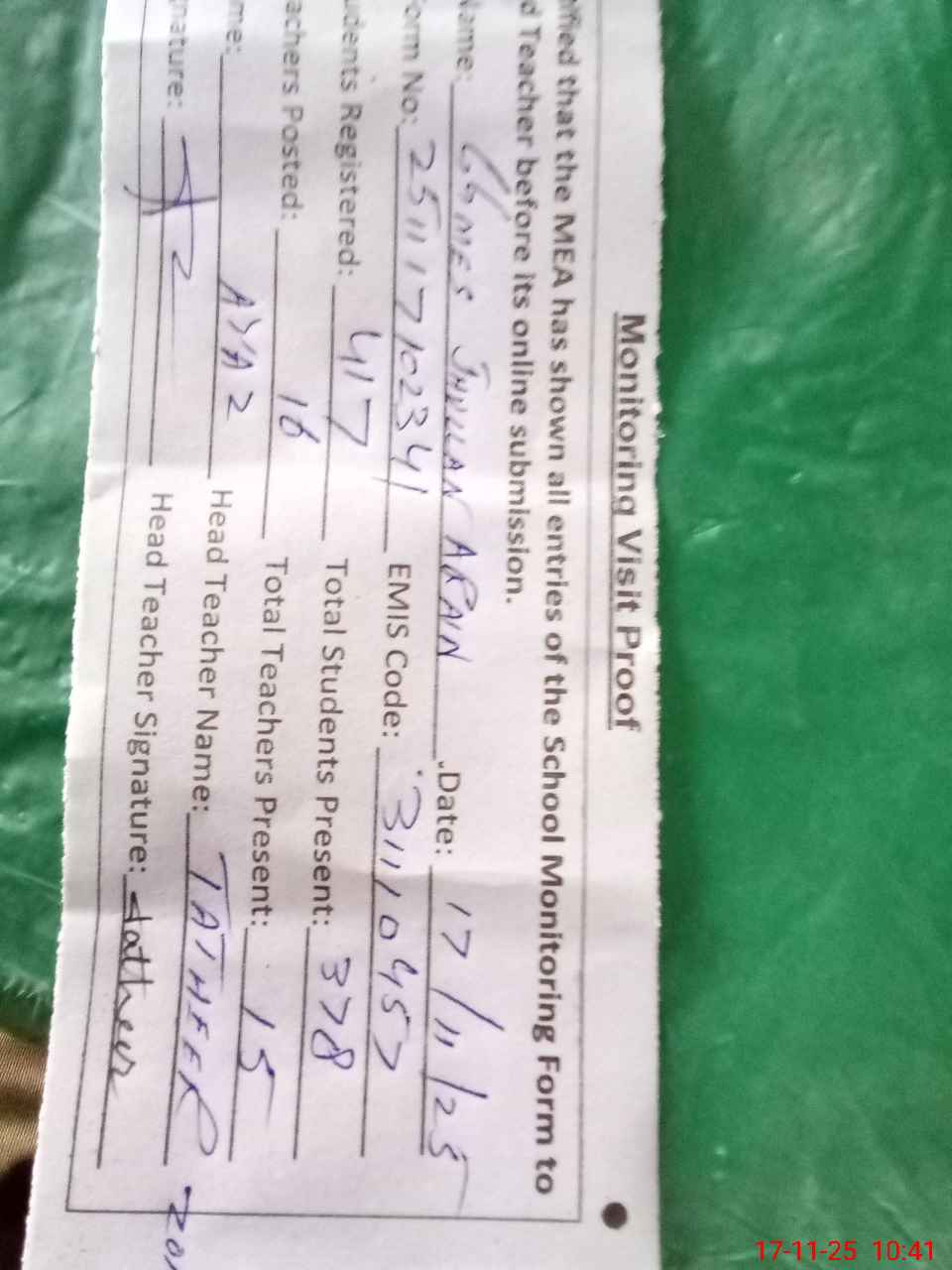 | Attendance Register | Head Teacher | MEA with School | Visit Proof |