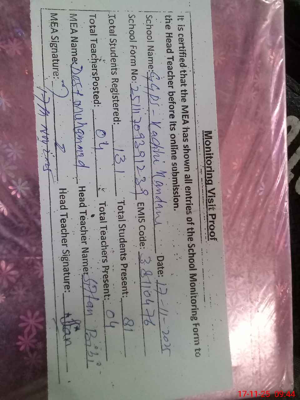 | Attendance Register | Head Teacher | MEA with School | Visit Proof |