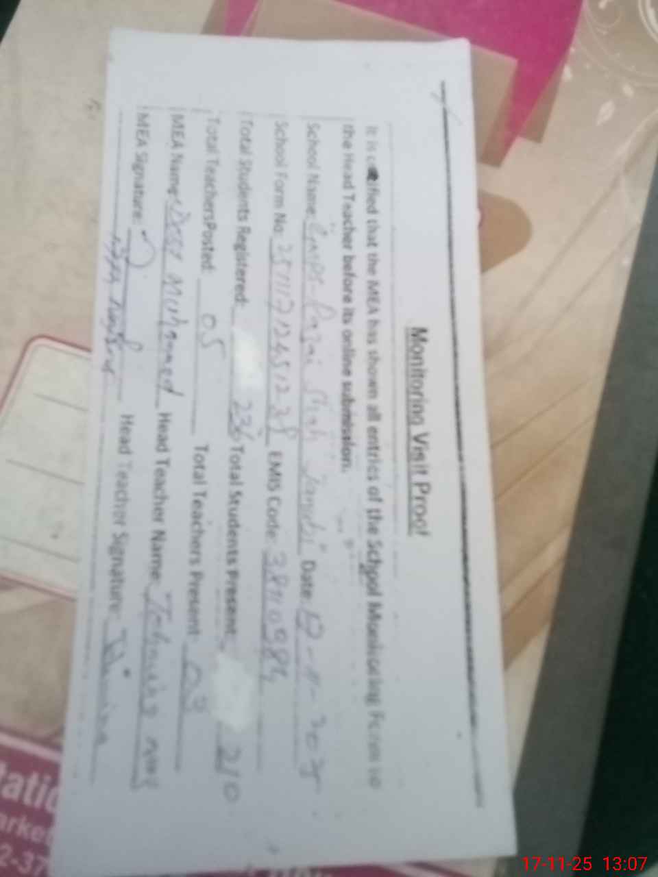 | Attendance Register | Head Teacher | MEA with School | Visit Proof |
