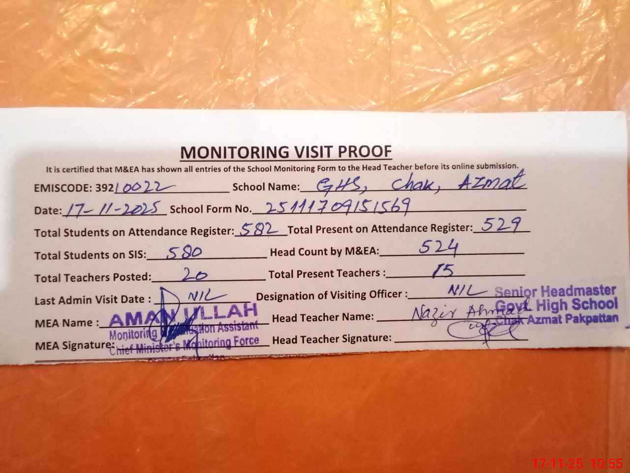 | EMIS Code: 39210022 | Name of School: GHS CHAK AZMAT | |||