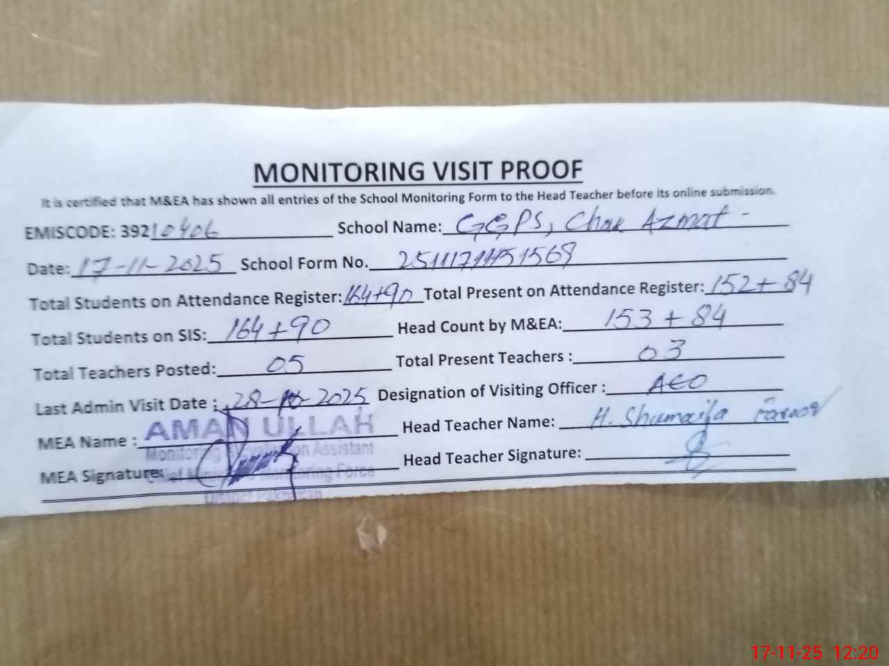 | EMIS Code: 39210406 | Name of School: GGPS CHAK AZMAT | |||